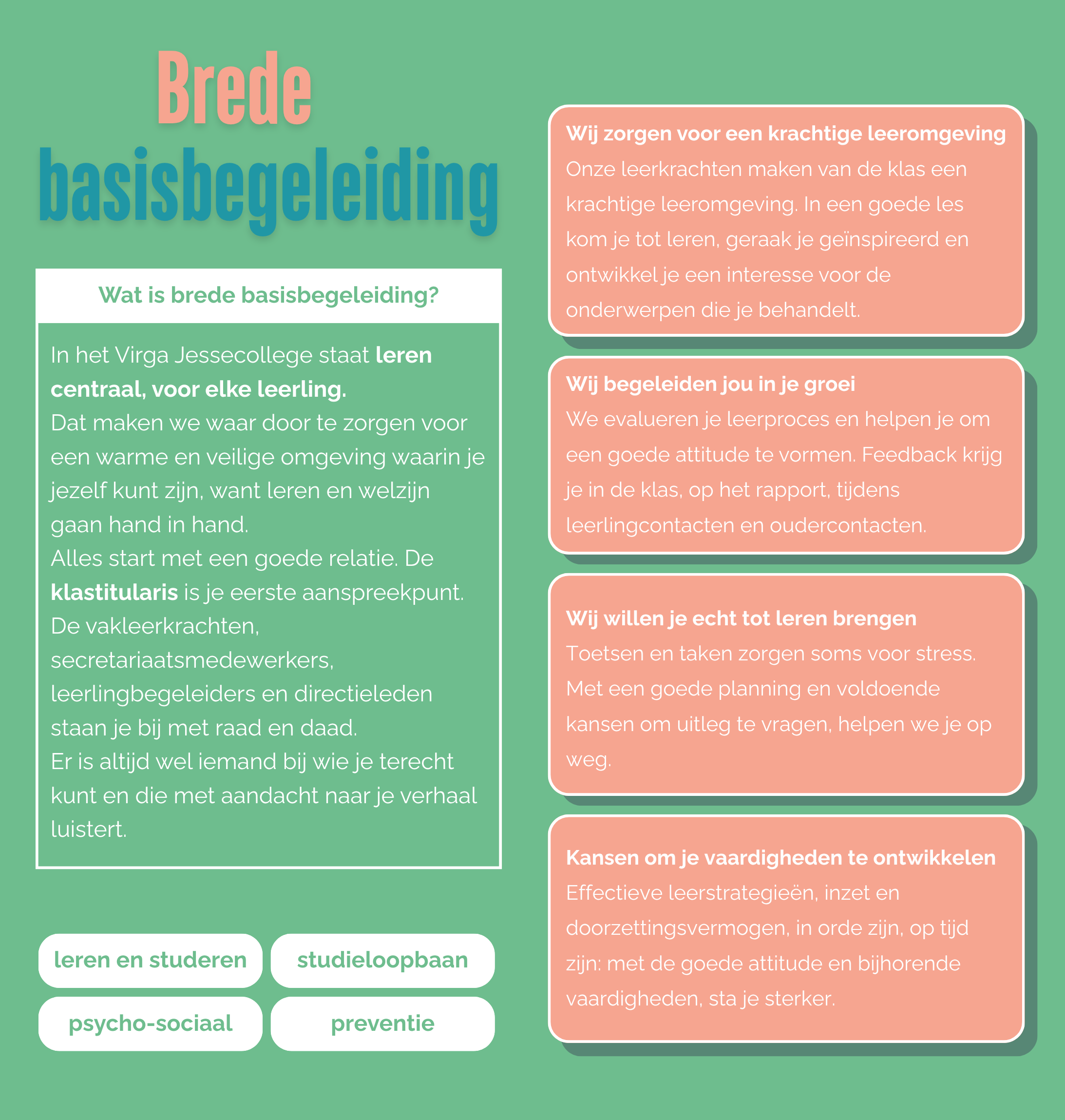Organisatie en coördinatie van initiatieven voor alle leerlingen op de 4 domeinen van zorg: onderwijsloopbaanbegeleiding, leren en studeren, psychisch en sociaal functioneren, preventieve gezondheidszorg |